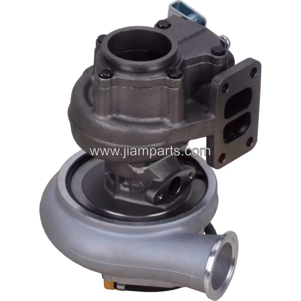 The turbocharger housing and turbine components are made from high-temperature-resistant materials designed for heavy-duty environments.